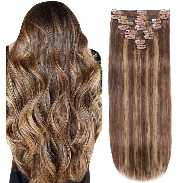 Tebelove Clip in Hair Extensions Real Human Hair 3.4oz/90g Clip ins 100% Human Hair Extension for Women 8pcs Per Set with 18 Clips Double Weft (14 Inch #4/27 Chocolate Brown to Honey Blonde)