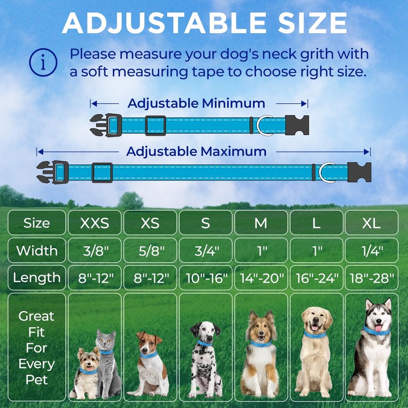 - 𝗔𝗗𝗝𝗨𝗦𝗧𝗔𝗕𝗟𝗘 𝗦𝗜𝗭𝗘: Careful design ensures easy size adjustment of the collar to provide a perfect fit for your pet: dogs and cats of all sizes and breeds.Fantastic choice for puppies and kittens. Great for all dog breeds including but not limited to: german shepherd, rottweiler, doberman, chihuahua, pitbull, bulldog, labrador, beagle, poodle, husky, yorkie and many more