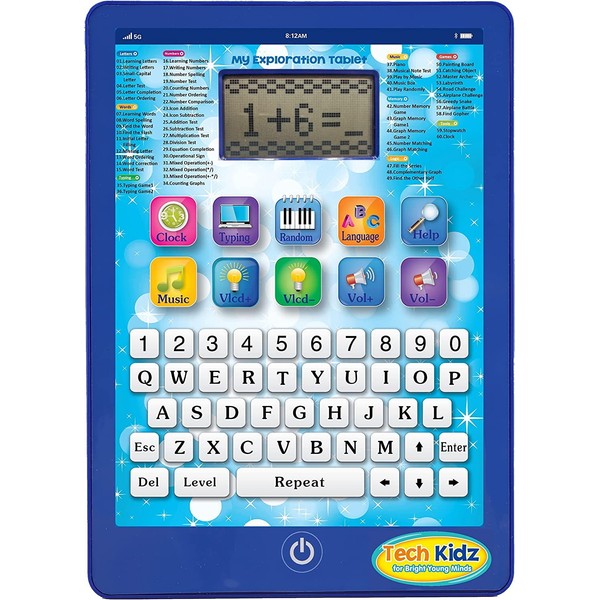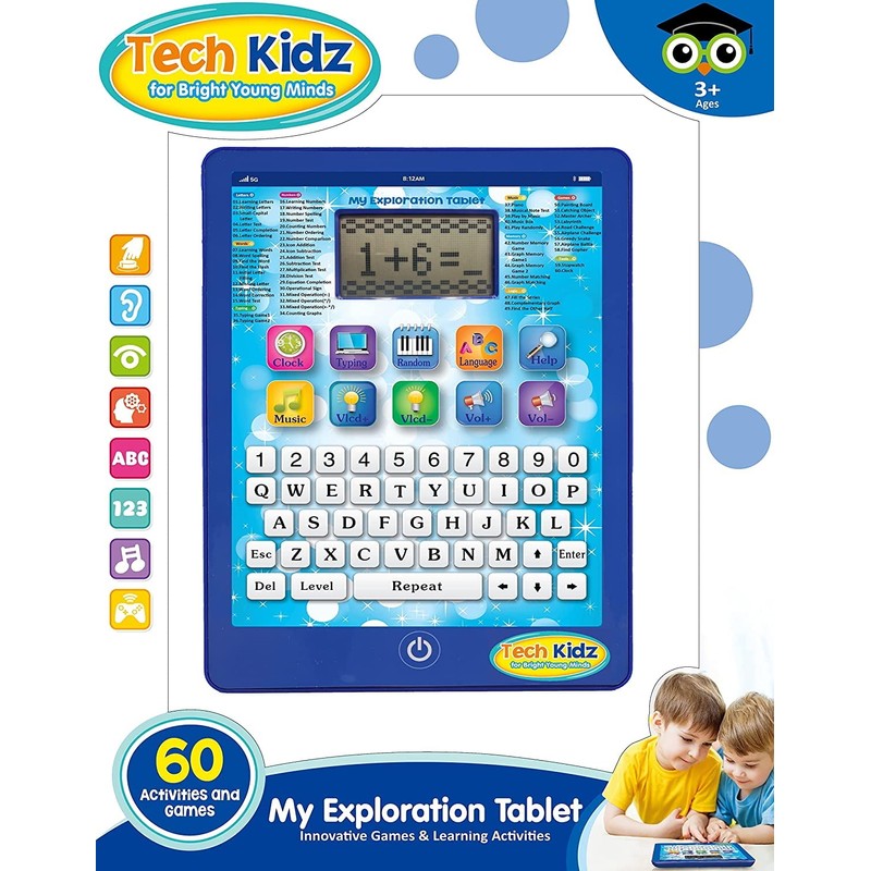 Bring advanced educational learning everywhere you go with the most advanced and cutting edge toy learning tablet in the marketplace! The Tech Kidz My Exploration Tablet comes bundled with 60 challenging educational learning games and activities!. This most state-of-the-art, fully loaded kids tablet allows you to play 60 math, spelling, logic, memory, problem solving and music games! Children can learning everything from ABCs, 123s to advance math and spelling! Placing hassle-free, no mess edutainment at your kids fingertips all of the time! Perfectly compact the exploration tablet is convenient and portable for car or plane rides, and fits into most backpacks.