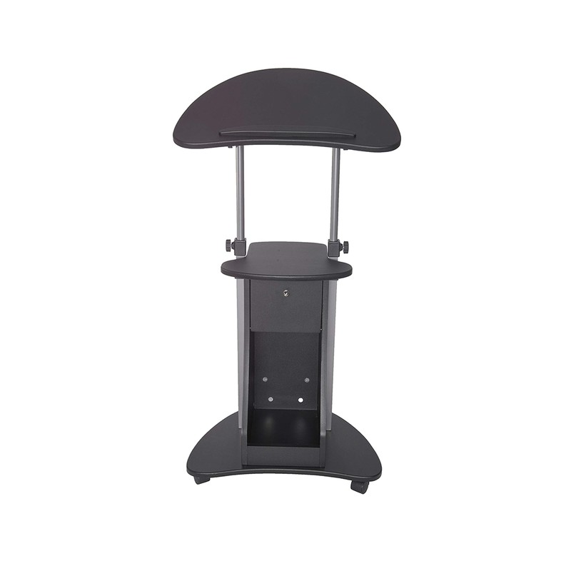 The Techni Mobili Deluxe Rolling Laptop Cart with Storage is made of heavy-duty engineered wood panels with a moisture resistant PVC laminate veneer and a scratch-resistant powder-coated steel frame. The table panel tilts so you can adjust it to the most ergonomic, comfortable working angle. It also features a safety edge-stopper to prevent objects from sliding off when tilted. You can easily adjust the table height between 30.75 and 45.5-Inch with dual adjustment knobs. There is an open storage compartment and a closed storage compartment with bottom hinges. Two of the fours non-marking nylon casters include locking mechanisms. The table and closed storage top and bottom shelves each have a 20 lb weight capacity and the base of the cart has a 30 lb weight capacity. COLOR: Black.