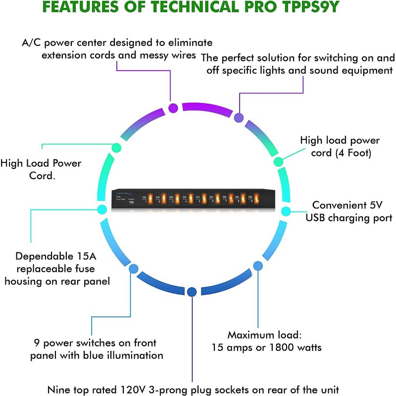 Technical Pro Electric Power Supply with 9 Power switches, 1800 Watts Max Load, 5V USB Charging Port, 9 Outlet High Load Power Cord (4 Foot)