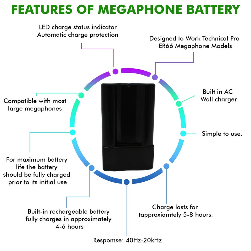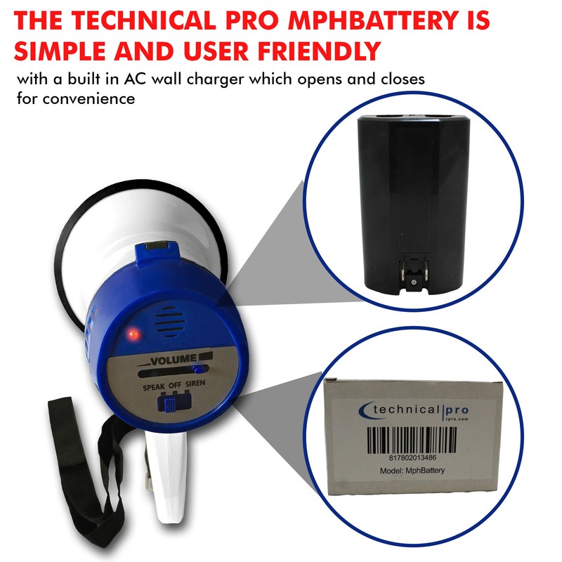 The Technical Pro MPHBattery is universal and compatible with most large megaphones including Pyle, Seismic, and Ampli-vox. The Technical Pro MPHBattery is simple and user friendly, with a built-in AC wall charger which opens and closes for convenience, and an LED indicator to let you know its fully charged. Any time you purchase a Technical Pro product you are protected by the technical pro guarantee. if at any time you are not satisfied, just reach out to us, and a member of our team would be happy to help you!