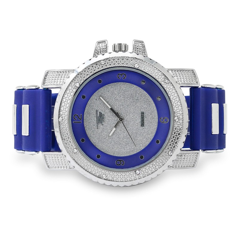 Techno Pave Totally Iced Out Cz Silver Tone Blue Band Over Sized Hip Hop Men's Bling Bling Watch