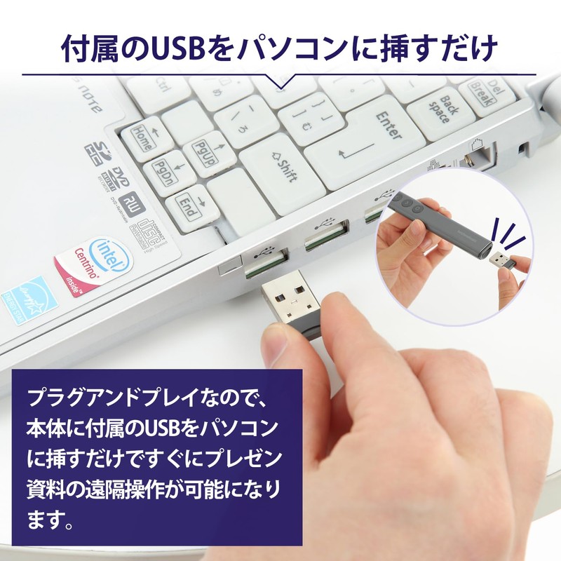 Plug and play, just insert the receiver included with this product into your computer and you can control it remotely. No complicated setup required. Easy to get started, so you can forget the stress of your presentation and display with confidence.