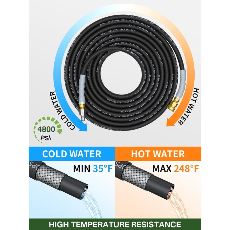 • 【Commercial Grade Pressure Washer Hose】3/8" power washer hose is made of high-quality synthetic rubber & tensile steel braid, MAX working pressure can reach 4800 PSI with 16000 PSI burst pressure, Withstands high temperatures up to 120℃ /248°F. designed for a commercial and industrial pressure washer for homework and business.