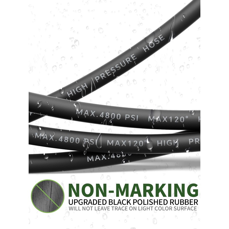 • 【Swivel Quick Connect Kink Resistant】4800 PSI high pressure washer hose is equipped with a swivel 3/8" quick connect, which will help you relax more, no hose kinks, and can be used at any angle. It is also equipped with 2 M22 14MM adapters, which can handle the cleaning work easier and faster, better support your home washing car, motorcycle, floor, window, driveway, roof, siding.