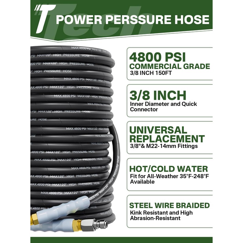 TechSweepPro 3/8" 4800PSI Pressure Washer Hose 150FT with Swivel Quick Connect for Cold/Hot Water Max 248°F, Kink Resistant Steel Wire Braided, Wear Resistant Power Washer Hose with M22 14mm Adapter