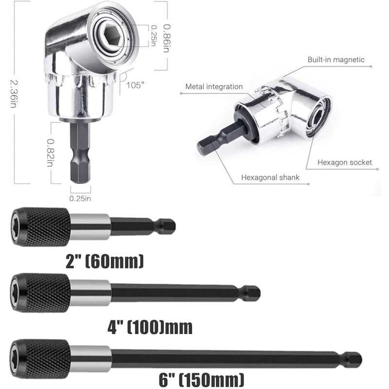 - 105°Angle Extension - 1/4inch 6mm Hex Drill Bit Screwdriver Socket Holder Adaptor, 1/4 inch hex drive shaft is quick change compatible and fits most power drill, rechargeable drill, manual wrench and driver chucks,Magnetic 1/4 inch hex socket accepts and holds standard drill and driver bits