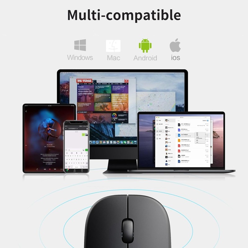 - Conectividad Multi-Dispositivo. El mouse para laptop utiliza una red inalámbrica de 2.4GHz y Bluetooth 5.0 y 4.0 para conectarse a múltiples dispositivos sin esfuerzo, sin necesidad de cables. Asegura un funcionamiento suave hasta a 10 metros de distancia, permitiéndote disfrutar de una conectividad perfecta con la tecnología Bluetooth.