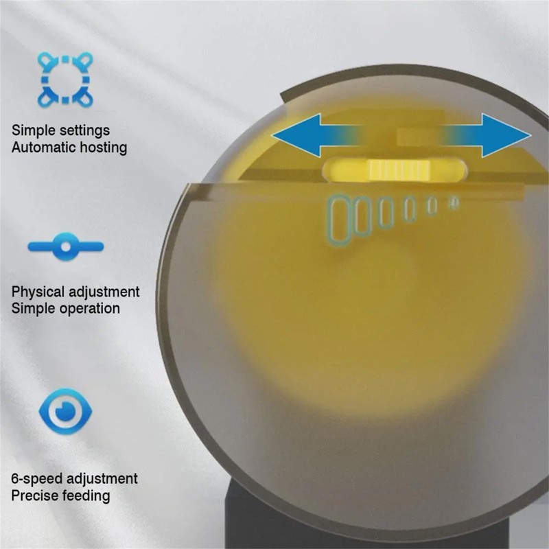Scientific Feeding: Adjust the feeding amount through the adjustment switch on the feeding box, and press the button to feed automatically immediately, without affecting the timing setting. Dual time zone feeding, 12 hours/time to the left and 24 hours/times to the right.