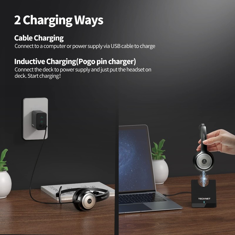 - LONG BATTERY LIFE & EFFICIENT POGO PIN CHARGING BASE: TECKNET plug-and-play charging base provides convenient charging and storage solutions. Charging for 2 hours can provide up to 2 days of talk time and 4 days of standby time for the computer headset with microphone. When you really need to charge a telephone headsets, the fast charging base can charge a wireless pc headset by 30% in just 30 minutes, and charge to 100% in 120 minutes.