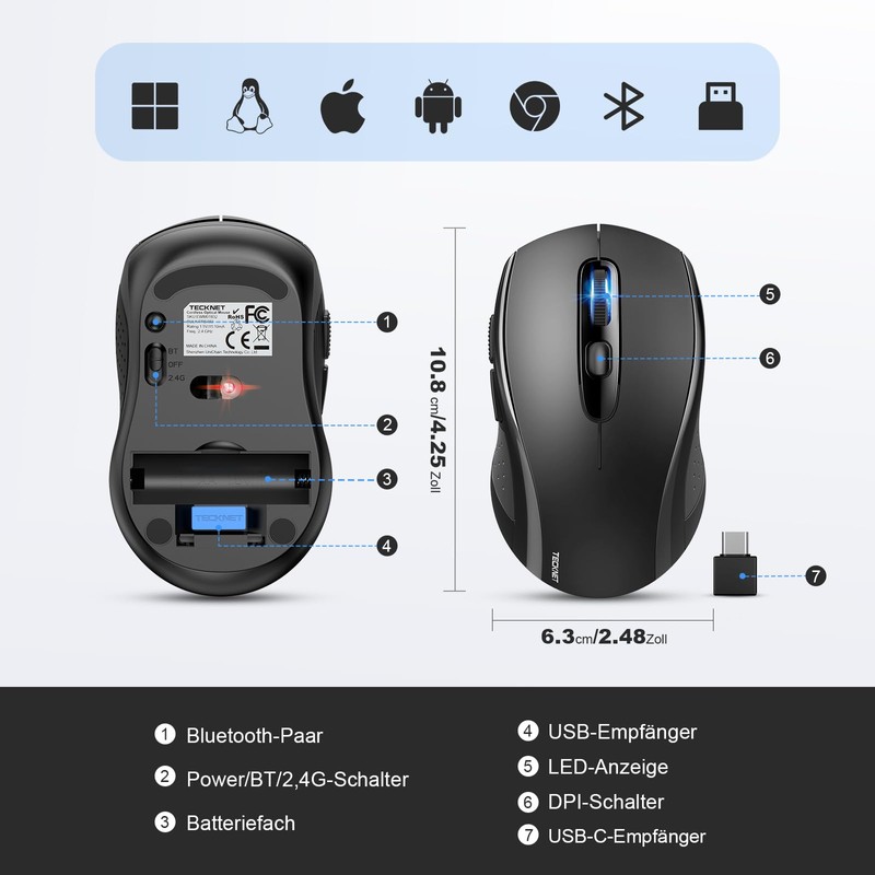 TECKNET Bluetooth Mouse, 2.4G Wireless Mouse (BT 5.0/3.0 + USB A + USB C) 4000 DPI Portable Ergonomic Mouse, 6 Levels DPI Wireless Mouse for Laptops, Mac OS, Android, Windows, Black