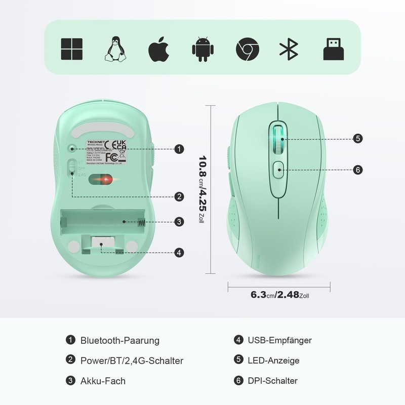 TECKNET Maus Kabellos, Bluetooth Maus (Tri-Mode: BT 5.0/3.0+2.4GHz) Funkmaus mit USB-Empfänger, Ergonomische Tragbare Maus Bluetooth für Laptop PC Computer, Mac OS, Android, Windows, Grün