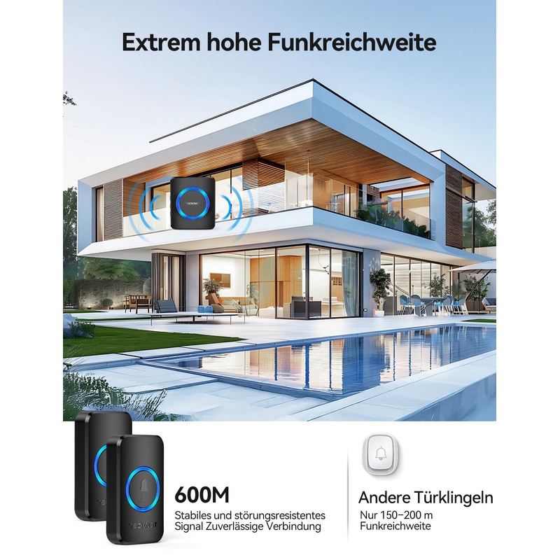 - 600 m / 1.968 ft wireless range: the powerful and stable wireless signal of the doorbell does not interfere with other devices in your home or your neighbours, so you do not miss a visitor, even if you are several rooms away or on another floor