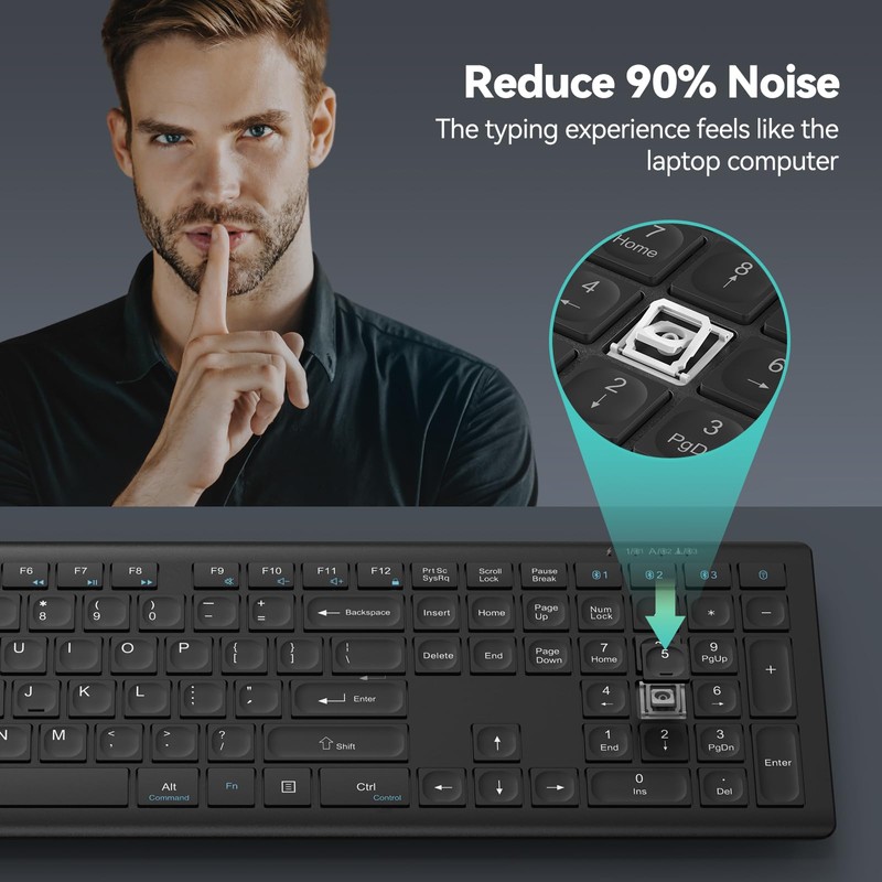 • 【Quiet & Fluid Typing, Deep Focused】The silent keyboard is equipped with 110 upgraded scissor-switch keys, offering 90% noise reduction, durability up to 10 million keystrokes. The 2mm key travel and moderate rebound ensure comfortable typing, even during long sessions. The silk-screened, matte UV-coated keycaps are designed to be wear-resistant, while 12 multimedia keys enhance productivity.