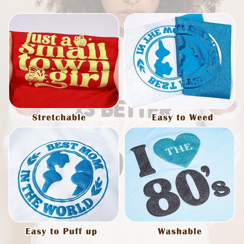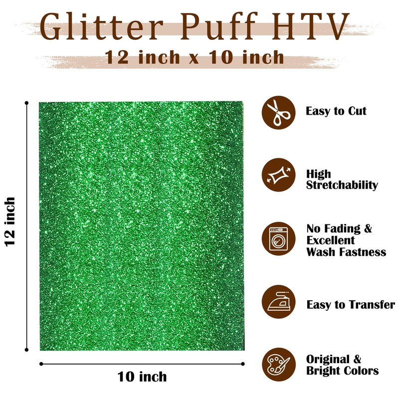 - Vibrant Glitter & Puff Effect for Eye-Catching Designs - Create stunning, dimensional designs with our glitter puff HTV vinyl. The combination of sparkling glitter and a raised puff effect ensures your projects stand out, perfect for custom apparel, bags, and crafts.