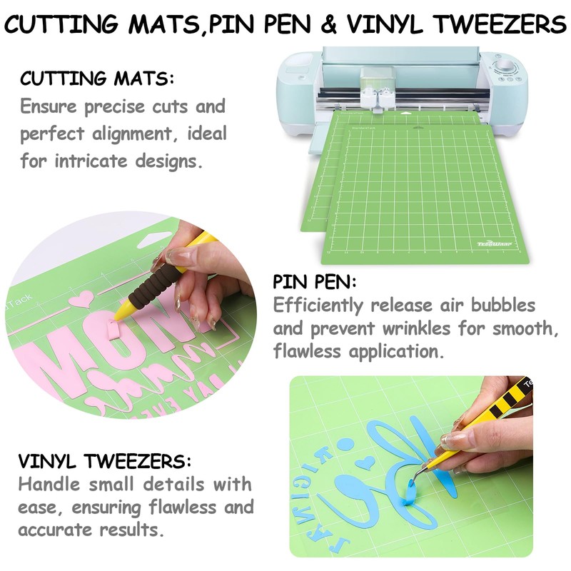 The set comes with essential tools to simplify your crafting experience. The vinyl weeding pen removes excess vinyl with precision, and the 2 standard grip adhesive mats provide a stable base for cutting. These tools ensure accuracy and efficiency in every project.