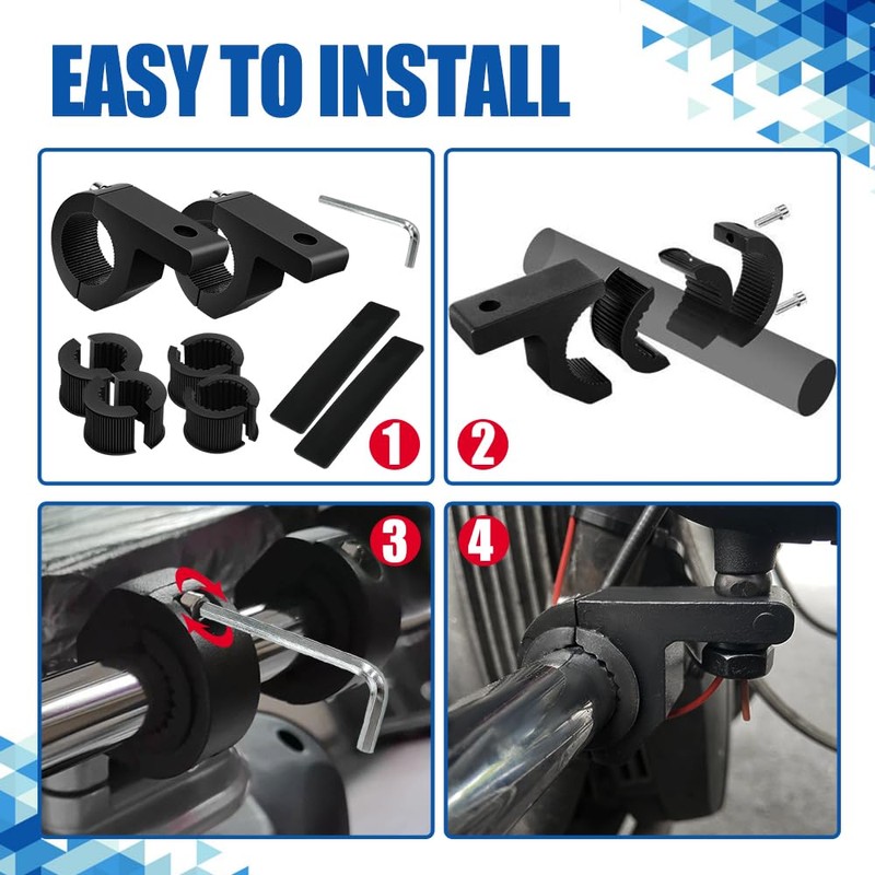 - [Easy installation]: The installation of the motorcycle mounting brackets is very simple, without complicated procedures, no modification or drilling, the lamp can be installed directly, and the multi-angle can be adjusted.