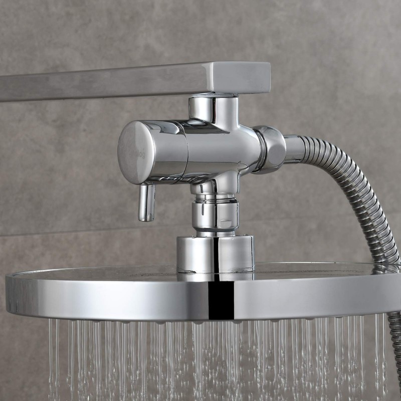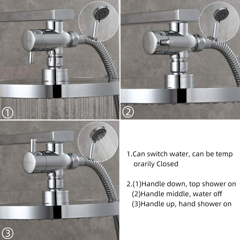 - Shower Diverter with Shut Off: It not only diverts water between the shower head and the hand shower, but also turns off the water on both