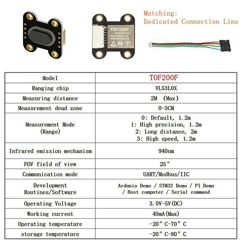 - Package includes: 1 x Tof200f VL53L0X laser distance sensor, 2 m distance serial port