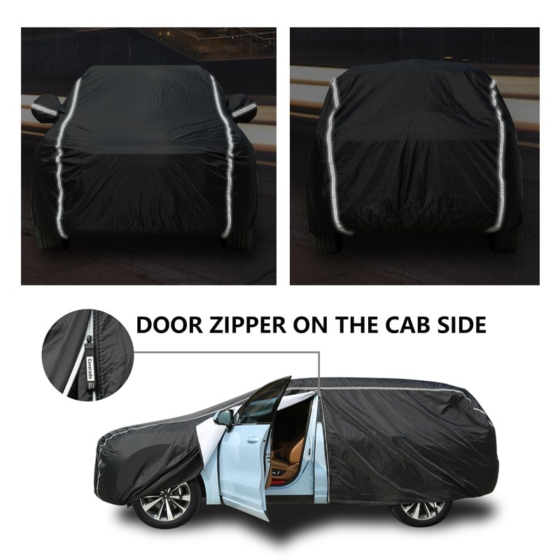 - UNIQUE DESIGN: 1. Convenient left CAB DOOR ZIPPER, easy access to your belongings at any time. 2. Three windproof straps (front, middle, rear) fix your car covers from being blown away by strong winds. 3. Large and long all-around reflective stripes on the car cover to remind others at night. 4. Tailor-made mirror pockets with reflective strips to make the car cover fit better.