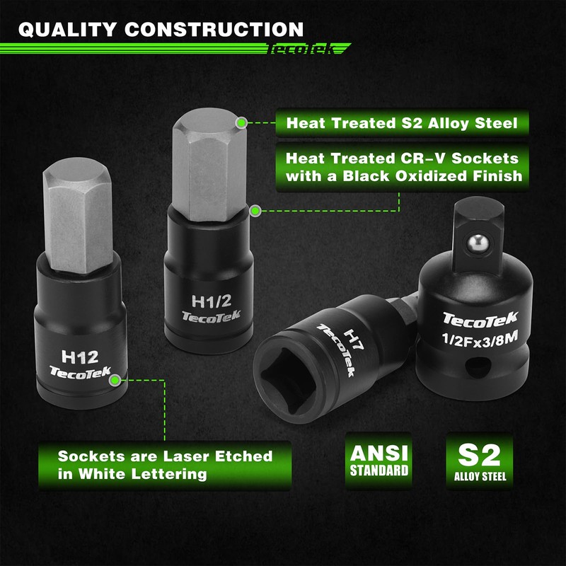 TecoTek 38PCS Hex Impact Bit Socket Set, 1/4", 3/8" and 1/2" Drive, SAE and Metric Allen Socket Bit, S2 and Cr-V Steel, S2 Steel, 5/64" - 3/4", 2mm - 19mm, Includes 5PCS Socket Adapters