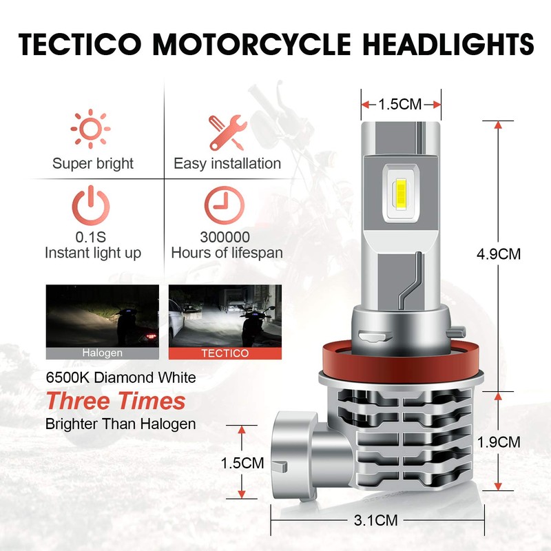 TECTICO H11 H8 H9 LED Headlight Bulbs 6500K Xenon White +300% Super Brighter High/Low Beam for Motorcycle Motorbike, 1 Lamp