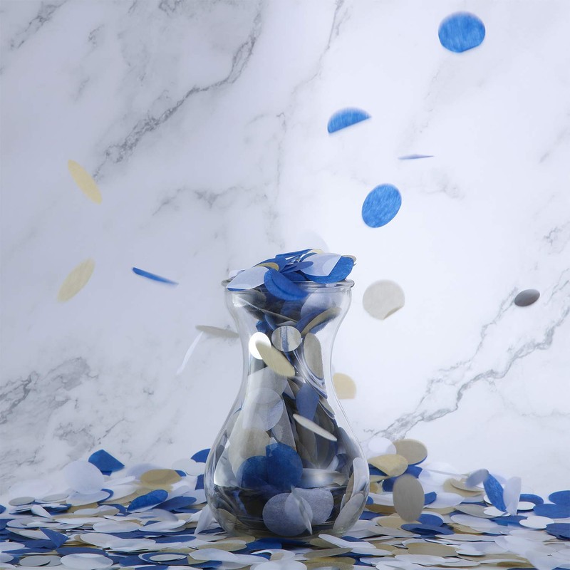- Different colors: white, blue and gold, colored confetti will be a good match with navy blue gold themed party decoration