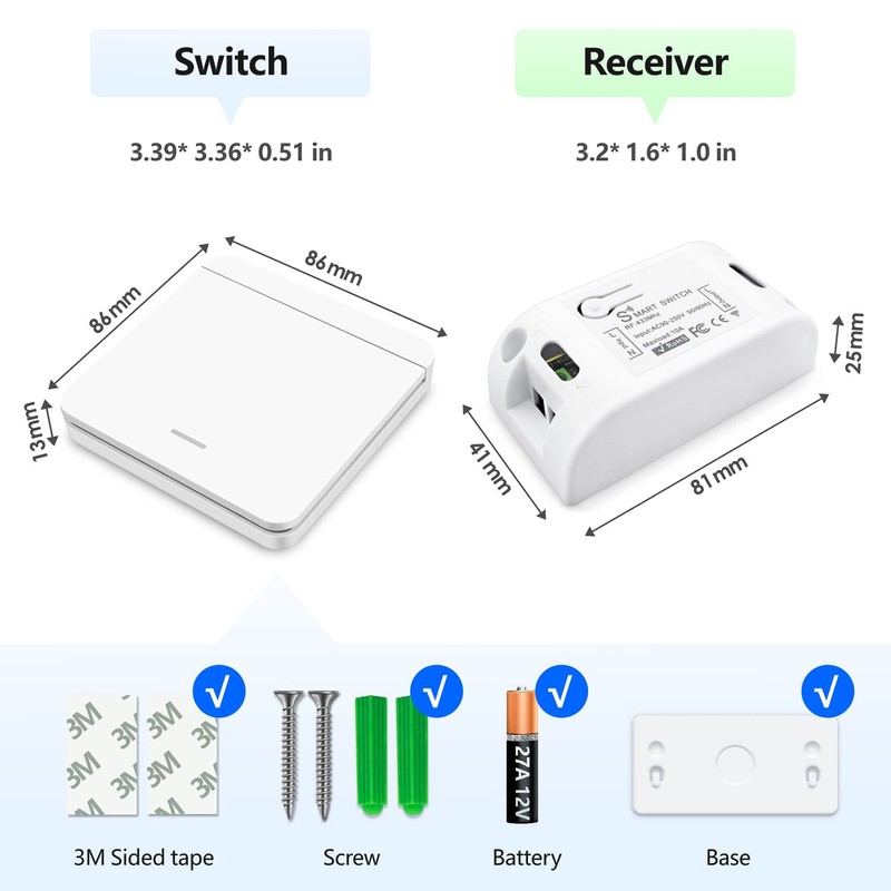 - CONTROL IN ANY PLACE The wireless switch can be separated from the wall switch base. The package is equipped with double-sided tape and screws. You can use double-sided or screw tape to fix wall panel base on glass or wall or refrigerator surfaces, etc.