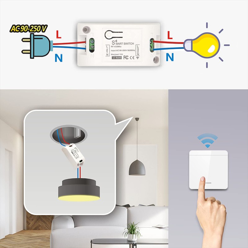 - Flexible use: 20 switches can control 1 receiver. Simply install the receiver between the device (the device that needs to be controlled) and the power supply (the neutral conductor is required). Outdoor 100 metres, indoors 60 m range. The remote control panel can instantly turn the device on and off from anywhere. Can be used to renovate a home or replace an existing switch without removing walls and laying cables.