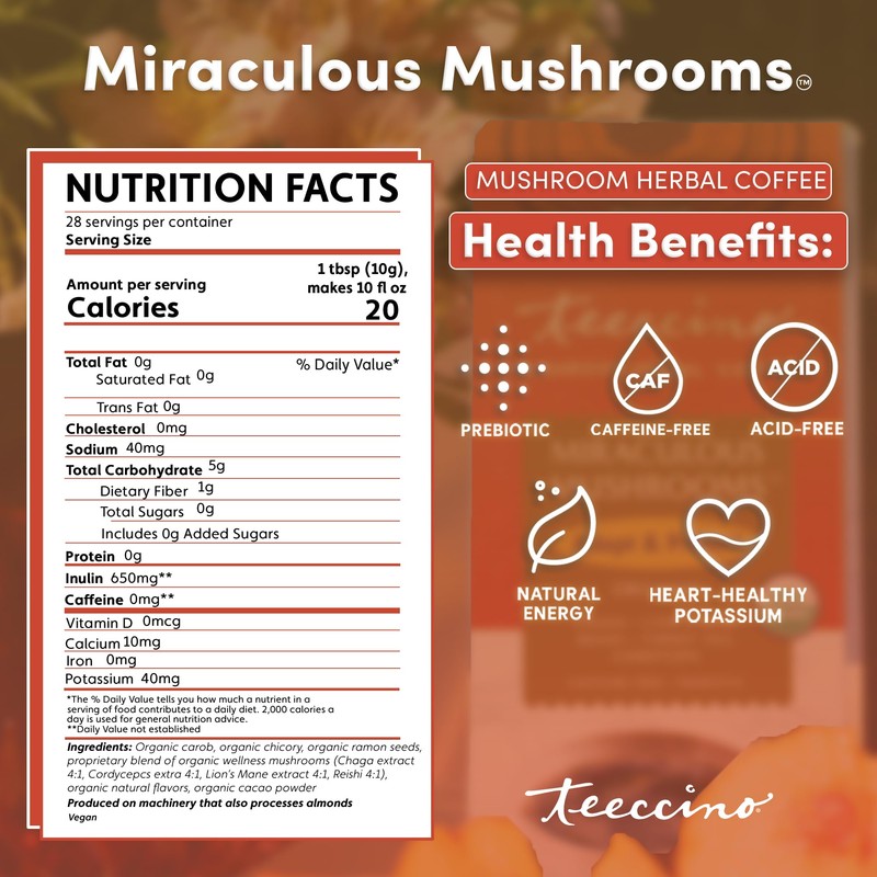 Teeccino Miraculous Mushrooms Adapt & Protect Coffee Alternative, 10 Oz – 5 Organic Adaptogenic Mushrooms with Chicory & Cacao, Caffeine Free, Prebiotic, Acid Free, All-Purpose Grind