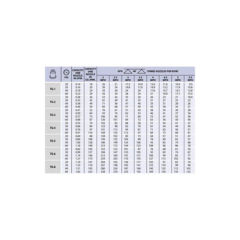 - TeeJet Brass Full Cone Spray Tip. 0.38 GPM @ 40 PSI. Pressure Range: 20-60 PSI. Provides coarse spray with full cone pattern. Used frequently for tobacco plant sucker control. More precise flow and distribution patter. Direct replacement for plastic hollow-cone, low-drift nozzles. Large orifice reduces clogging. Very large droplets.