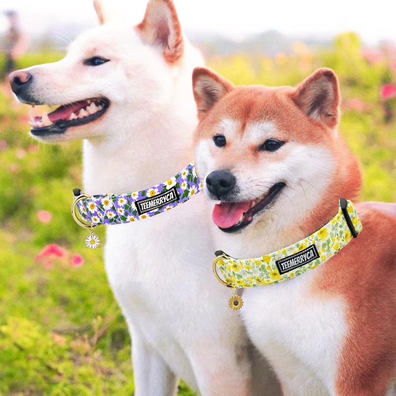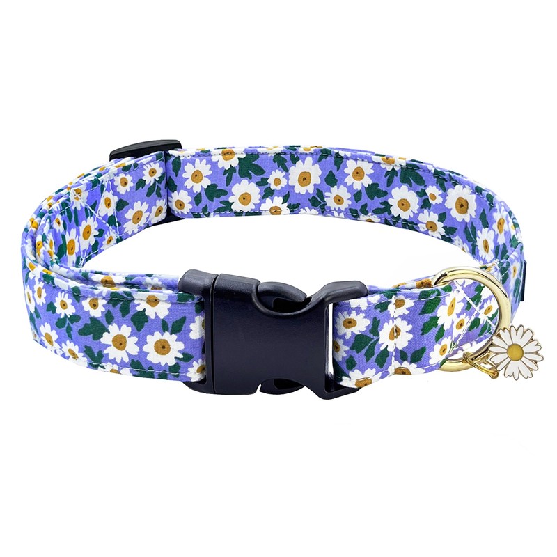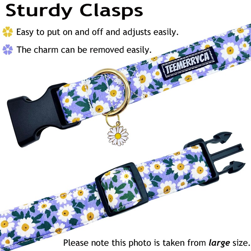TEEMERRYCA Summer Purple Daisy Floral Cotton Dog Collars with a Adorable Flower Charm Beautiful Pet Collar for Large Dogs Girl Boy, L