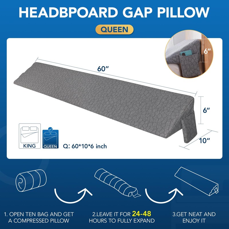 - ✔【Perfect Wedge Pillow】-If you are struggling with losing items through the gap in your bed frame behind the pillow –our mattress gap filler is just for you! Our bed wedge pillow measures 60"x 6"*10". This bed gap filler can fill a gap from 0 to 7 inches, and the mattress gap filler queen can perfectly fill the gap between the headboard or wall and mattress to prevent your pillows, phones, toys, remote controls or whatever else you have in bed with you from falling out of the bed.