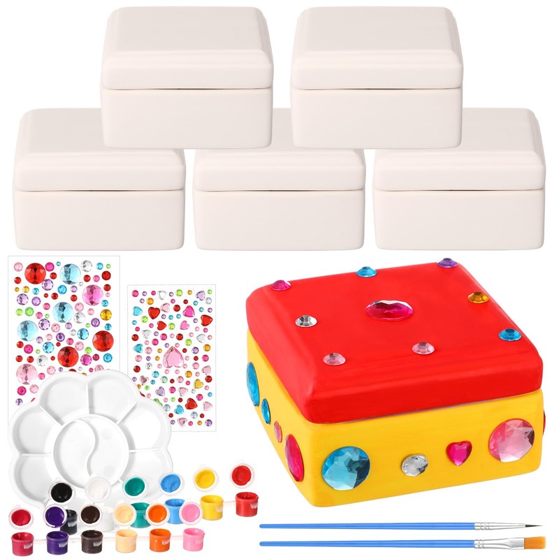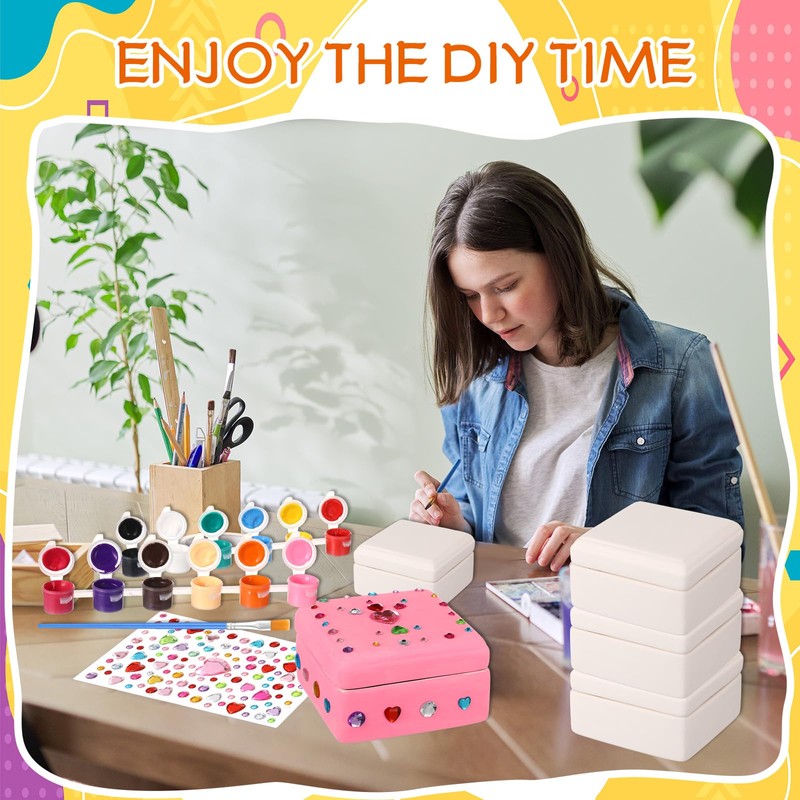 - Complete Package: to satisfy your creative demands, we provide you 6 ceramic square boxes, 2 acrylic paint strips, 2 brushes, and a palette; There are also 3 sheets of diamond stickers for decorating