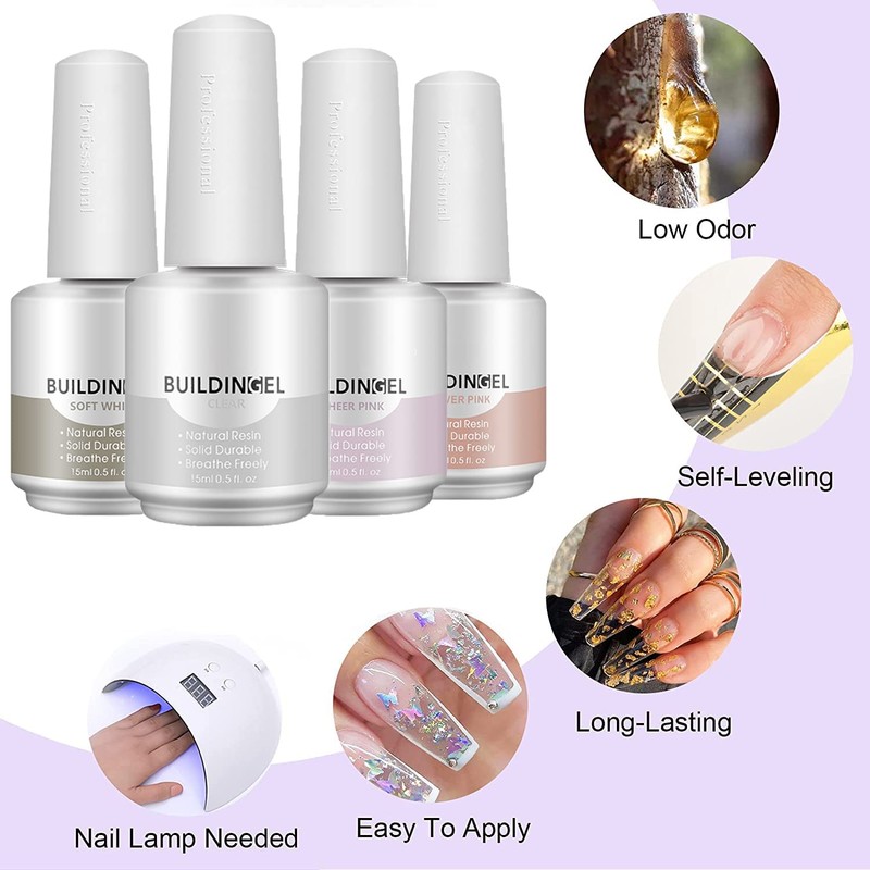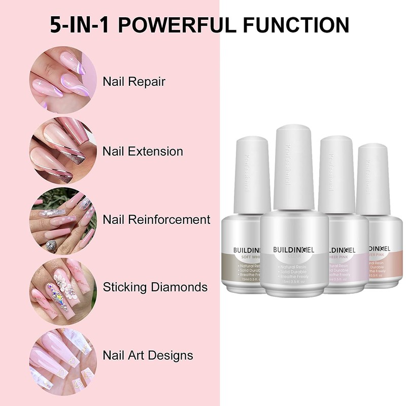 - 5-in-1 building nail gel kit: contains 4 colours of building nail gel in one bottle (transparent pink, transparent, pink and soft white), 100 pieces nail shapes, nail file, nail shaping. This multi-purpose product is ideal for nail extensions, broken nail repair, reinforcement, gluing diamonds, nail art design, and provides a strong and protective base gel.
