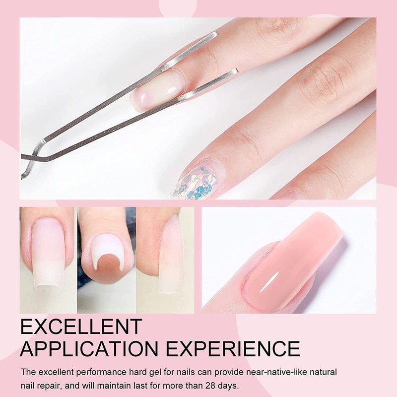 - Strong strength and stable: the excellent performance hard gel for nails creates a mirror-like shiny and wear-resistant nail surface that is no longer fragile and shatterproof, whether it is extensions or gluing diamonds, lasts more than 28 days.