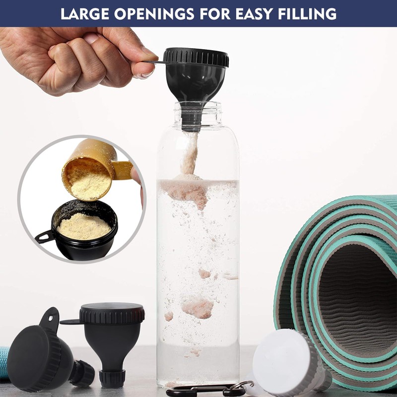 - EASY TO FILL VARIOUS WATER BOTTLESThe protein funnel's unique design makes pouring protein powder into water bottles, shaker cups, and other containers an easy and stress-free process. Protein powder funnel's leak-proof seal ensures that you don't waste a single scoop of your precious supplements!