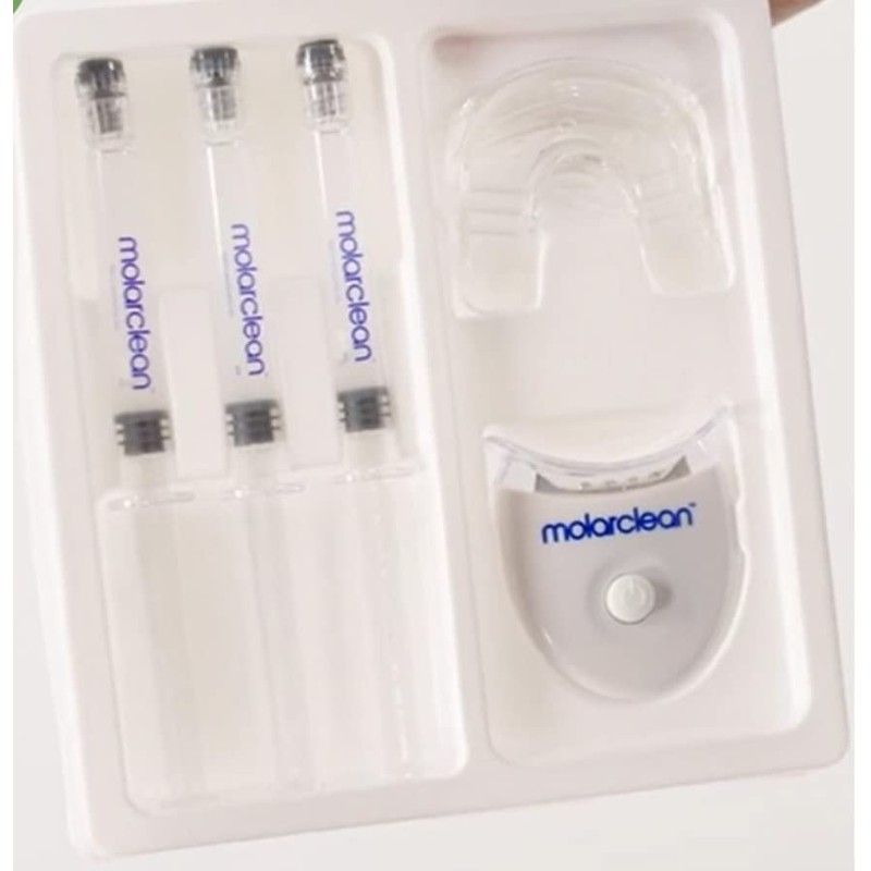 TEETH WHITENING KIT Teeth Whitening Kit by Molarclean Blue light accelerator weakens stains so the whitening serum can work more effectively. – 9 Applications – Noticeably whiter teeth – Leading PAP whitening serum – No pain or sensitivity – Vegan friendly