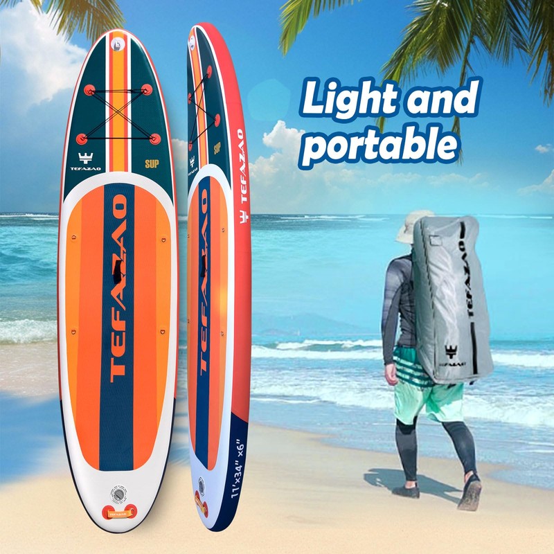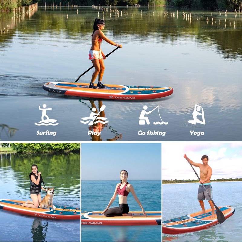 • 【Spacious and Stable Design】TEFAZAO Paddle board has specifications of 11' length, 34'' width, 6'' thickness. The maximum weight capacity of the paddle board is 400 Pounds, The width is sufficient to accommodate 2 people, Ideal for calm lakes, rivers and coastal waters, Its versatile design ensures a fun and safe experience for all water activities.
