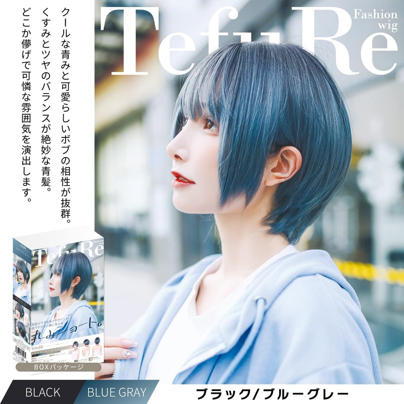 TefuRe D-3110-BkBgy Short Bob Wig, Heat Resistant, Full Wig, Black Hair, Brown, Gray, Blue, Natural, Round Silhouette, Wig Net Included, Round Short, Black, Blue Gray