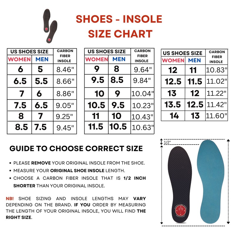- →EXACT MATCH: Please select your insole length according to your shoe size from the second picture. Place the order according to the length of the sole. Don’t worry! They will fit perfectly. We have solved the mismatched shoe size and insole length issue mentioned in other stores. Please use this carbon fiber insert below your original removable shoe insole or under orthotic.
