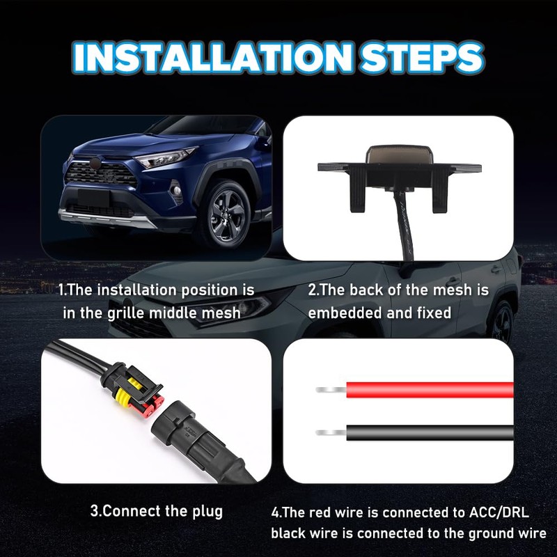 • EASY INSTALLATION: Simply snap the Toyo-ta Tacoma RAV4 Grill Lights in according to the corresponding grille to hold it in place. Red wire connects to ACC+/DRL, black wire connects to earth wire. 2020-2024 Tacoma RAV4 daytime running lights are equipped with fuse adapters, which can stabilize the current and facilitate better installation.