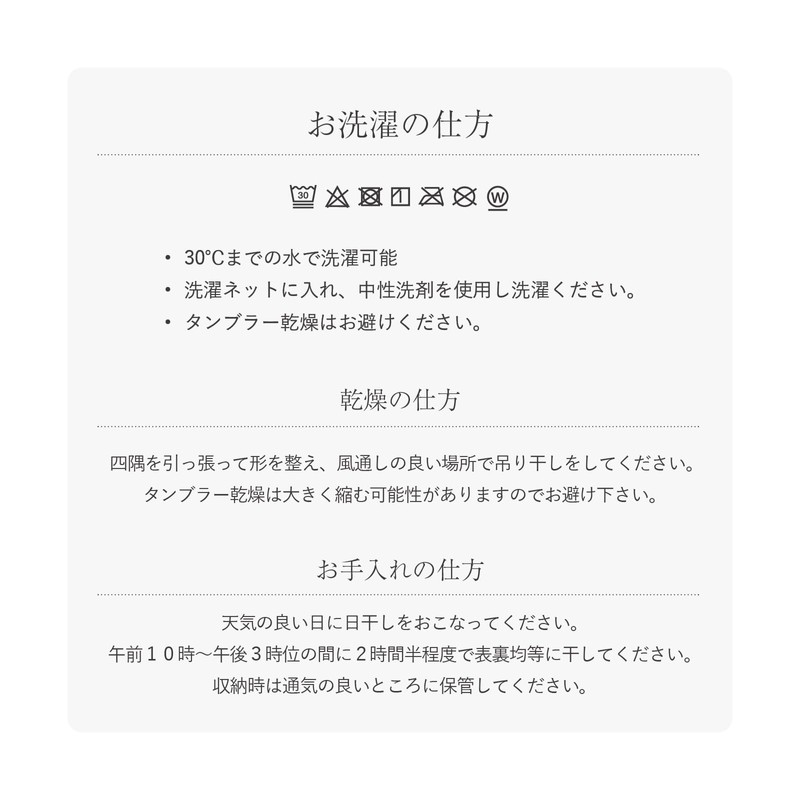 - Since it is not laminated, it has excellent moisture permeability, and it does not contain chemicals such as mites repelling agents, making it safe and secure