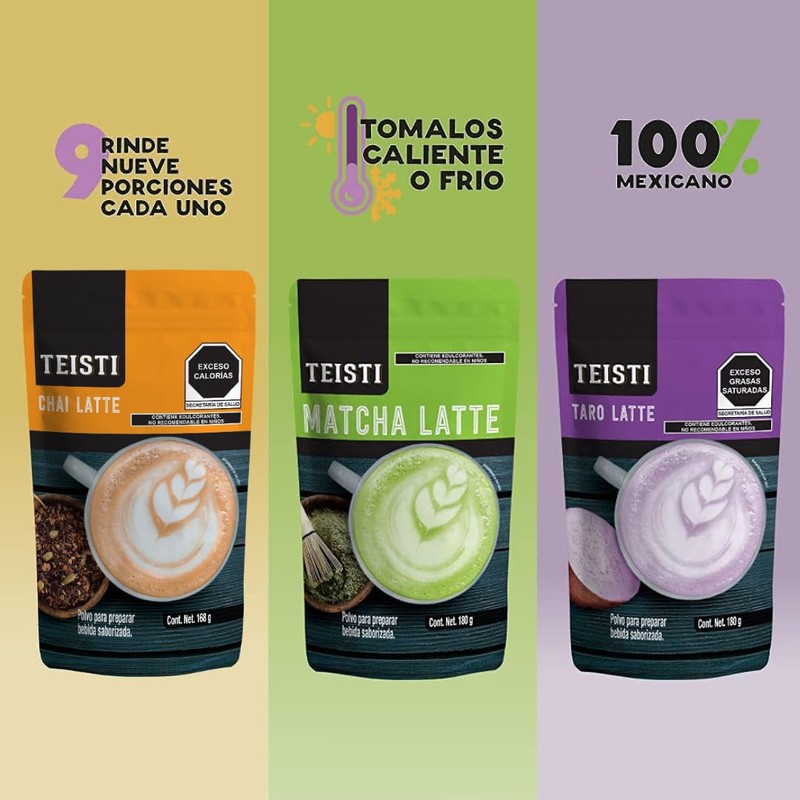Tus 3 sabores favoritos de Teisti llegan juntos, disfruta de nuestras deliciosas bebidas en polvo sabor Matcha, Taro y Golden Milk. Rinde hasta 9 porciones cada una y solo se requieren de 2 cucharadas para su preparación.