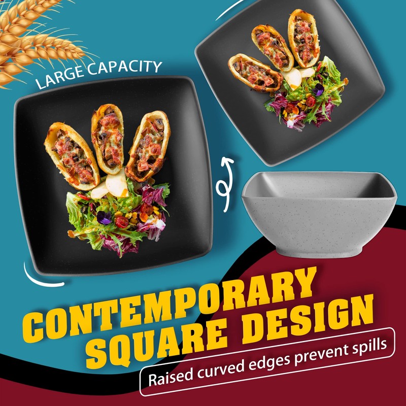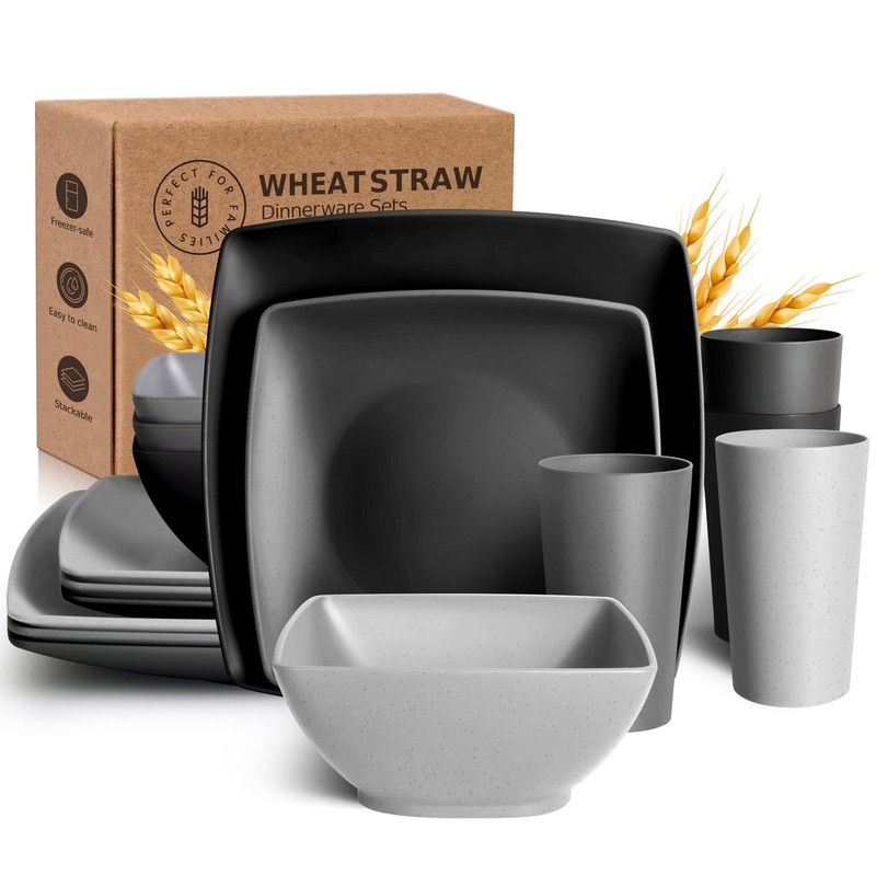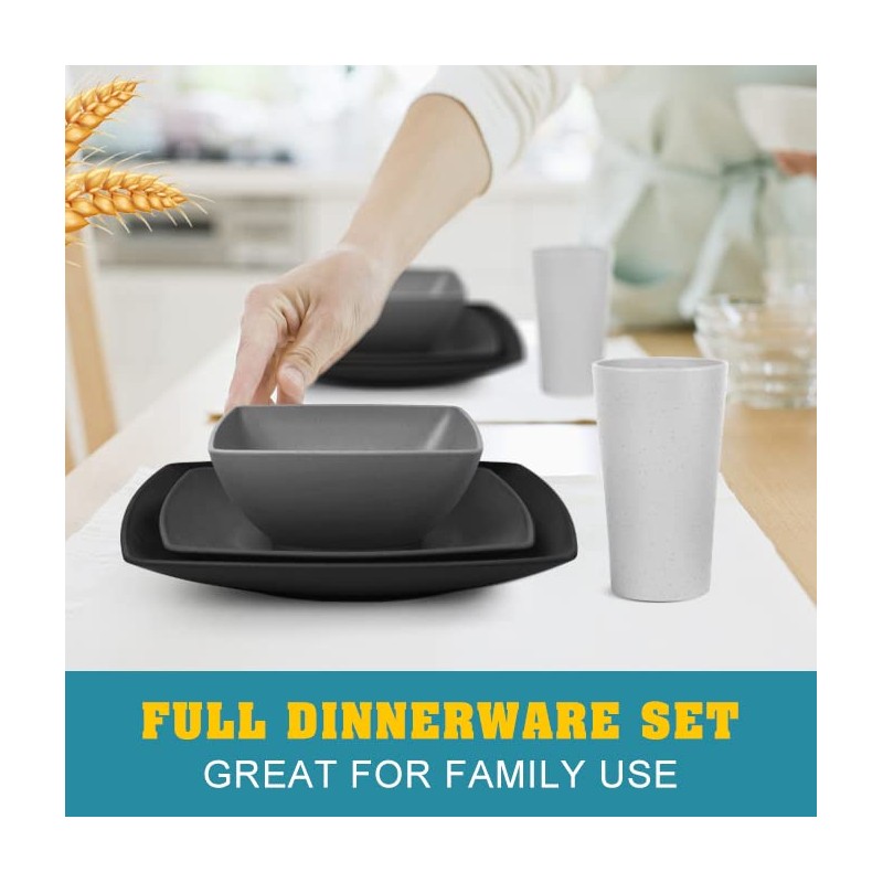 Teivio 16-piece Plastic Wheat Straw Square Dinnerware Set for 4, Unbreakable Dinner Plates, Salad Plates, Snack Bowls, Tumblers 20 oz, Dishwasher Safe, Gray Ombre