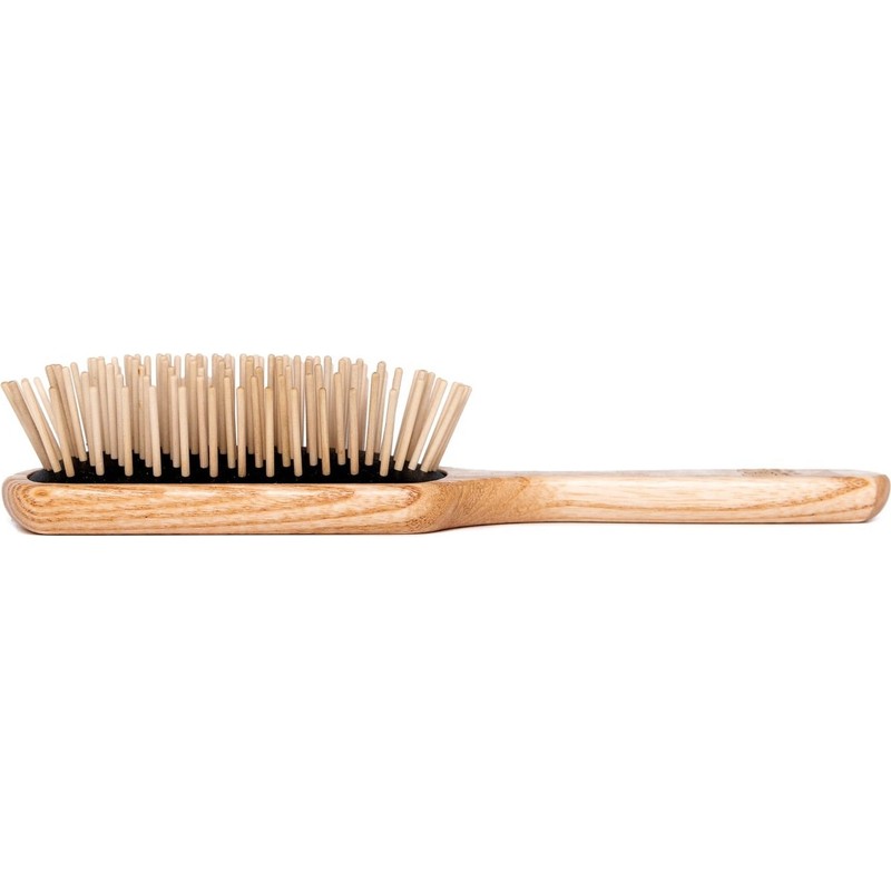 The rectangular brush is 22 x 6.5 cm in size and is made from FSC® certified ash wood that is treated with linseed oil and carnauba wax. The hornbeam wood bristles are attached to a black rubber cushion.