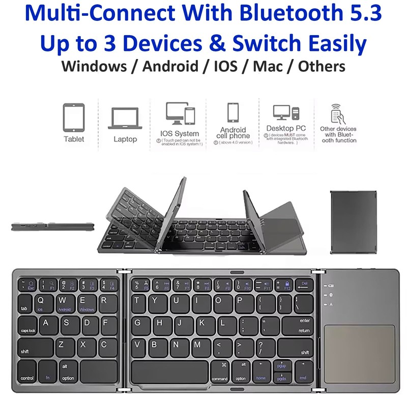 • ⌨【FOLDABLE TRI-FOLD DESIGN】 : Our FULL SIZE Travel Keyboard is Extremely thin and foldable keyboard can be a perfect gift for anyone who often travel or on a business trip. It allows you to operate your mobile devices on the go. Write fast, easy and error-free! It is also a good choice for editors
