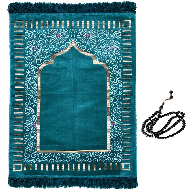 Tekbir Mihrab Taffeta Ottoman Prayer Rug - Elegant Design Velvet Islamic Janamaz - Padded Portable Namaz Carpet for Muslims - Sajadah Mat (Teal)