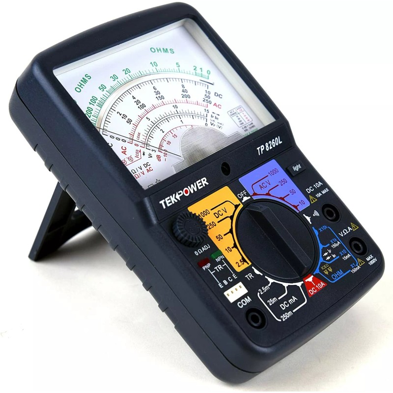 The Tekpower TP8260L is a 20-Range Analog Multimeter, which you can use to measure AC/DC voltage, DC current, resistance, continuity, decibel values/dB and diode test. This meter is well known for its accuracy at its low DC voltage and current measurement, to measure a DC voltage up to 1000V, you have four ranges to choose, they are 2.5V, 10V, 50V,250Vand 1000V. For DC current, you can measure current as low as a few milli amps using the 2.5 mA range with 3% accuracy. The transistor dock is good for both PNP and NPN types.